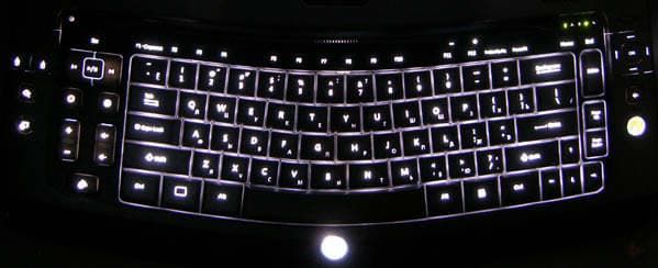 Именно клавиш, притом почти всех, а не межклавишных зазоров. Мы не разбираем тестируемые устройства. Одно из условий предоставления на тесты — возврат в полностью товарном виде, притом у всех, с кем мы работаем. Но с вероятностью 90% подсветка выглядит так, как будто светодиод установлен в каждой клавише и элементе управления. Дополнительный аргумент в пользу этой теории — световые эффекты при гашении. Если мы правы, то это именно идеальный вариант подсветки. Если нет, то добиться примерно такого же эффекта можно применением трёхслойного бутерброда: лампа, рассеиватель сложной конструкции с пеньками-световодами (они же поршни, по которым скользят клавиши) и непроницаемый для света слой, изолирующий межклавишные промежутки. Тоже неплохо. Какой вариант дороже в реализации на данный момент — сказать затрудняемся, но явно дешевле третий, самый распространённый сейчас: несколько источников света, неровно подчёркивающих в основном межклавишные щели. О точечной засветке нескольких клавиш и говорить нечего.