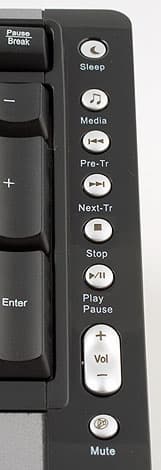 Нельзя сказать, что функциональность выдающаяся, но уровень вполне современный. Для ее реализации клавиатура снабжена одной дополнительной клавишей, двумя двухпозиционными кнопками и четырнадцатью обычными, то есть суммарно имеем 19 дополнительных функций, как и в случае большинства современных массовых мультимедийных клавиатур.