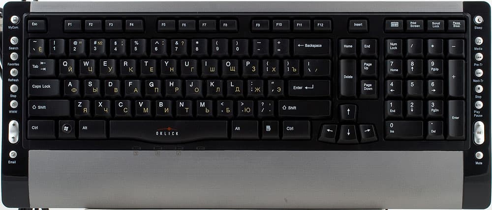 А на блок редактирования без слез и не взглянешь. На данный момент существует два основных способа его испоганить: расположение в матрице 2 × 3 вместо стандартной 3 × 2 (для уменьшений размеров клавиатуры) и увеличение вдвое клавиши Del с выносом Ins в верхний ряд (а для чего делается это, прогрессивной науке пока не известно). Какой из вариантов выбрали в Oklick? Оба! К этому точно придется привыкать, и не факт, что привыкнете. Хорошо только тем, кто за компьютерами работает давно (20 лет и более) — они обычно блоком редактирования и не пользуются, предпочитая дополнительную цифровую клавиатуру.