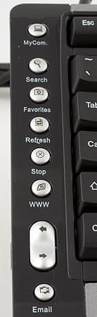 Кнопки расположены почти симметрично по обоим бокам клавиатуры. Верхняя слева открывает «Мой компьютер», правая предназначена для управления питанием. В отличие от всех остальных, она единственная не выпуклая, а вдавленная и немного углубленная, так что случайно вряд ли нажмете. Остальные кнопки из левой колонки предназначены для работы в сети: соответственно, сверху вниз Поиск, Избранное, Обновить страницу, Прервать загрузку, Вперед/назад (в виде двухпозиционной кнопки) и запуск клиента электронной почты. Правая — мультимедийная: запуск плеера, четыре кнопки управления им, двухпозиционная кнопка управления уровнем громкости и Mute. Сожалеть остается только об отсутствии скроллера, да кнопок редактирования (а в 360М они все были), но ими и при наличии не все умеют пользоваться .