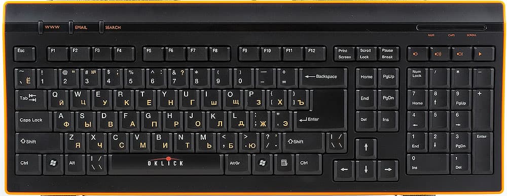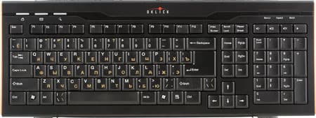 Но основные претензии, пожалуй, стоит предъявлять не к раскладке клавиш (как мы видим, она вполне «вменяемая» — существенных огрехов нет, а небольшие недостатки не всеми будут замечены), а к механизму их возврата. В обеих моделях конструкция клавиш все более модная сегодня — малюсенький «пенечек», на котором клавиша и держится. Особенно пугает данная конструкция в больших по размеру клавишах — Enter, например, просто болтается во все стороны на своем основании. Да и остальные впечатления чего-то прочного не производят. К счастью, в отличие от некоторых моделей предыдущих поколений клавиатур Oklick, проблем с быстрой печатью не возникает: нажатия не «проглатываются», сильно долбить по клавишам не нужно. Но и при приложении небольших усилий они ощутимо «гуляют» под пальцами, нажимаясь с сухим неприятным звуком. Долгая работа способна вызвать раздражение. Так что приходим к выводу, что клавиатуры сделаны не для нее. Письмо написать, да запись в блоге сделать — нормально, а писать часами не стоит: и стук клавиш сбивает с мыслей, и возникают опасения, что долго такой режим использования клавиатура не выдержит.