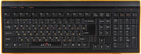 Начнем с модели с меньшим номером, хотя, как будет показано далее, можно было бы и наоборот. Итак, что собой представляет модель 420М? Несмотря на то, что она относится к среднему классу, корпус клавиатуры достаточно компактен и раскладка, соответственно, модифицирована. Последнее понравится далеко не всем пользователям, однако на сегодняшний день это стало достаточно привычным явлением. Традиционная «стандартная» клавиатура с небольшим количеством дополнительных кнопок. Несколько выделяют модель на общем фоне лишь две вещи: небольшая вогнутость корпуса (что многим позволит не использовать раскладывающиеся ножки — задний край клавиатуры и без них несколько приподнят) и вставки из оранжевой резины по бокам. Это неплохо сочетается с черным цветом самой клавиатуры и оранжевыми символами кириллицы на клавишах (очень хорошее сочетание, все более активно используемое всеми производителями, вместо крайне неудачных красных букв на черном фоне). В принципе, как нам кажется, тему оранжевого цвета имело бы смысл продолжить, сделав такими и светодиоды состояния клавиш-модификаторов — в текущей версии они синие, причем расположены под черной полупрозрачной пластмассовой вставкой, так что видны достаточно плохо.