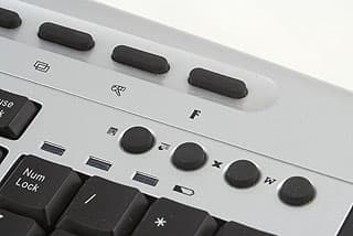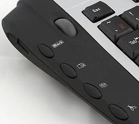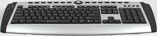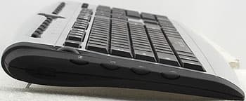 Все дополнительные клавиши и колесико прокрутки также «прорезинены». Хорошо и то, что дополнительные клавиши разделены на группы не только пространственно, но и по форме. Верхний ряд — это 14 узких клавиш продолговатой формы, разделенные регулятором громкости. Слева очень оригинальным образом (на ребре клавиатуры) расположены четыре дополнительные клавиши работы с буфером обмена. Оригинально, но нельзя сказать, что очень удобно — беря клавиатуру в руки, за края, неизбежно их нажимаешь. Зато правильным было решение расположить колесико прокрутки в непосредственной близости с Esc — его можно найти и вслепую.
