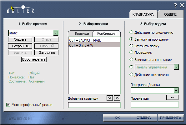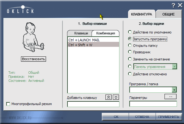Любопытно, что настраивать можно не только дополнительные клавиши, но и клавиатурные комбинации, причем как с дополнительными, так и только с основными клавишами! Например, пользуетесь вы двумя почтовыми клиентами (бывает такая потребность), и хотите, чтобы один запускался по соответствующей кнопке, а другой — по ее комбинации с Ctrl. Или хотите какой-нибудь хитрый хоткей для какого-нибудь действия. Нет проблем — все делается, как показано на рисунке выше.