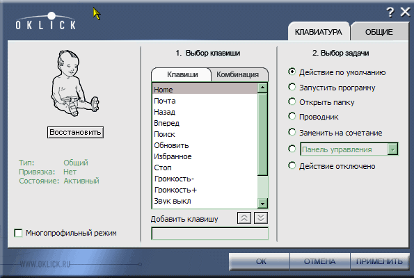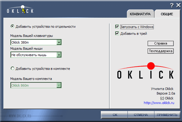 Подобное окошко можно увидеть при установке, либо позднее, воспользовавшись диалогом настройки. Видно, что программа универсальна — можно настроить поддержку клавиатуры, можно только мыши, а можно и сразу радионабора. Прочие кнопки и чекбоксы, думаю, понятны без объяснений :) Стоит отметить, что выбрать можно и стандартную клавиатуру (так что многие возможности программы будут интересны и пользователям отсутствующей в списке 580S или даже моделей других производителей), а мышь приветствуется только от Oklick. И правильно — на «левой» клавиатуре дополнительные клавиши обслуживаться не будут, так что полной их поддержки все равно не дождаться, а разные мыши слишком близки по функциональности, чтобы дарить конкурентам такой подарок, как хорошая программа-менеджер. Но мышей мы сегодня, по понятным причинам, касаться не будем — на повестке дня проверка возможностей программы совместно с мультимедийной клавиатурой Oklick, а точнее — указанной выше 380М.