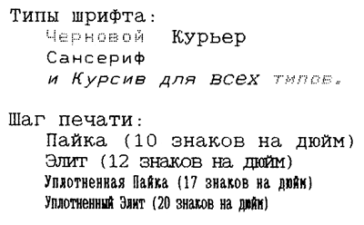Грамотная русификация подразумевает не только сам факт наличия у принтера русских шрифтов в нужной кодировке, но также поддержку нескольких стандартных размеров и вариантов начертаний шрифта. Кроме того, хотя это уже не относится к собственно русификации, принтер должен обеспечивать ряд режимов, ставших стандартом de-facto. Ниже в таблице сведены основные требования, которым должен соответствовать правильно русифицированный принтер, а рисунок рядом показывает стандартные типы шрифтов, взятые из "Руководства по эксплуатации принтера Epson-NX1500".