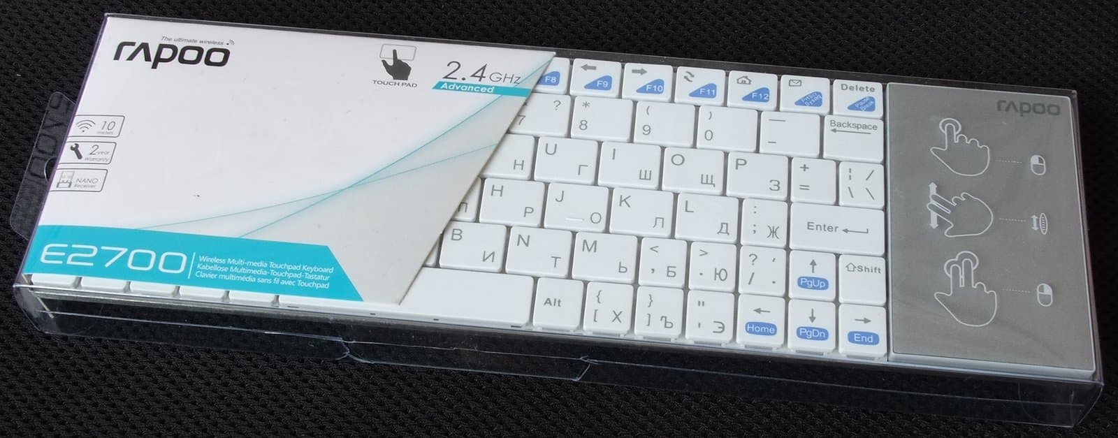 Rapoo E2700 поставляется в прозрачной пластиковой упаковке, демонстрирующей бо́льшую часть самой клавиатуры, остальное пространство занято бумажной вставкой с надписями, носящими исключительно пояснительный характер, крикливых маркетинговых лозунгов здесь нет. Над сенсорной панелью прямо на пластик нанесены наглядные подсказки по ее использованию.