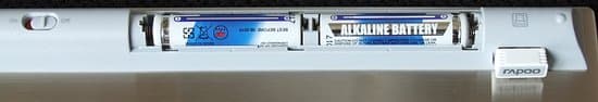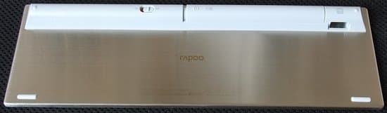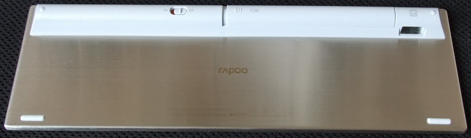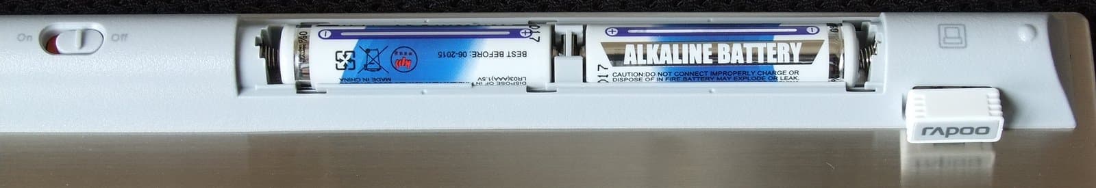Клавиатура работает от двух элементов типоразмера AA (входят в комплект поставки). Длина отсека почти соответствует ширине клавиатуры, что явно превышает длину двух батарей — вероятно, там же располагается радиомодуль, о чем косвенно свидетельствуют толщина клавиатуры и радиопрозрачный материал корпуса. В левой части отсека находится двухпозиционный (включение/выключение) переключатель, в правой — транспортировочное гнездо для приемника.