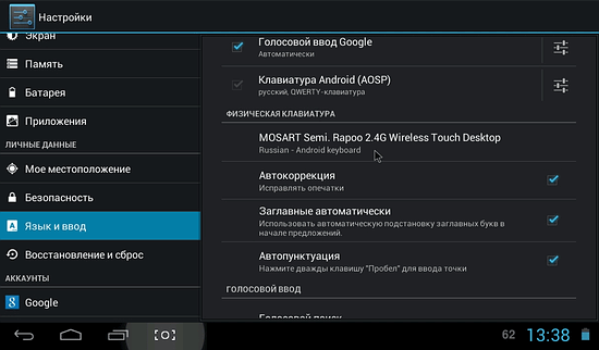 При подключении к планшету Ainol Crystal II (версия Android 4.1.1) через OTG-кабель Rapoo E2700 определяется как Mosart Semi. Rapoo 2.4 Wireless Touch Desktop.