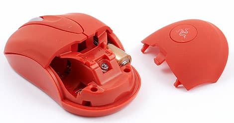 Мышь не то чтобы очень маленькая и лёгкая, по этим параметрам она относится, скорее, к среднему классу, чем к максимально портативным моделям. Форма — почти правильная полусфера со срезанными боками. Верх состоит из четырёх частей — это две кнопки, пассивная площадка вокруг колеса и задняя часть — крышка батарейного отсека. Крепится на защёлки, снимается и одевается легко, но сидит надёжно. На ней — логотип, он подсвечивается светодиодом. Мигает при подключении, в обычном состоянии иногда тоже помаргивает. По идее, должен сигнализировать о разрядке батареек, но чётких указаний мы на это не нашли, а при установке почти разряженной пары, его реакции не заметили. Под крышкой посадочные места для двух батареек AA, полярность промаркирована чётко.