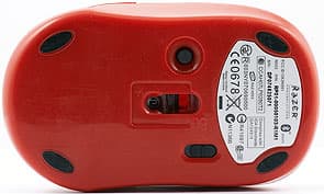 Брюшко и боковины сделаны из глянцевого пластика. Держать за него мышь не очень приятно, пальцы липнут и потеют. Однако из-за этого захват надёжный. Бока слегка вогнуты, форма получается полностью симметричная и хорошо подходит для обеих рук. На брюшке — четыре очень маленьких лапки чёрного тефлона по углам. Точно по центру — сенсор с красной подсветкой. По бокам от него — кнопка «connect» и выключатель, не лишний на носимой в сумке мышке. Там же — наклейка с технической информацией.