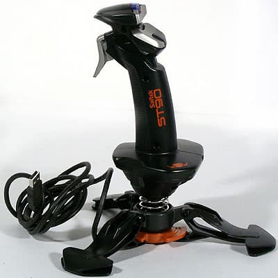 Чем придется пожертвовать? Разумеется, модель менее анатомическая, нежели Evo и даже ST290 подрегулировать ничего невозможно. Впрочем, джойстик подходит как под правую, так и под левую руку, подставка под которые тоже сохранилась (пусть и перестала быть регулируемой). Кнопок, разумеется, меньше, а переключатель видов исчез вообще, зато не придется отказываться от управления газом, несмотря на отсутствие throttle. Как им управлять? Помимо курка на рукоятке расположены четыре кнопки, две из которых не являются обычными кнопками, а как раз представляют собой цифровой регулятор газа (рядом с ними, кстати, как и в более дорогих моделях расположена пластмассовая вставка, подсвечиваемая синим цветом, — прямо таки фирменная особенность). У цифрового и аналогового подхода есть сторонники и противники, лично я предпочитаю аналоговый — только он позволяет практически мгновенно сбросить газ до нуля или «дать чаду» по-максимуму, не проходя последовательно все промежуточные значения, однако… С учетом компактности джойстика и его цены, лишь немного превышающей 20 долларов, следует радоваться тому, что контроль газа вообще присутствует. Свои первые полеты на РС я совершал на четырехкнопочном джойстике на присосках без всякого throttle (хоть аналогового, хоть цифрового), который стоил, кстати, дороже, чем Saitek ST290, и ничего — железные кресты через некоторое время греб пачками :) С клавиатурой удобство управления не сравнимо даже в случае самого простенького и дешевого джойстика тех времен, а сегодня Saitek предлагает нам трехкнопочный трехосевой джойстик весьма оригинальной конструкции за смешные деньги.