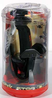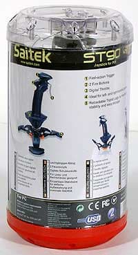 Переходим к испытуемому. Так он выглядит в упакованном виде, располагаясь в пластиковой «банке», как головастик в икринке (как метко окрестили его у нас в офисе — «консервированный джойстик»). Первый взгляд на упаковку способен вызвать уныние. Не нужно быть выпускником инженерного ВУЗа, чтобы знать, что устойчивость любого сооружения зависит от площади его основания (а если нормаль из центра тяжести не попадет в основание, то вся конструкция мгновенно обвалится). Джойстики начального ценового диапазона нередко имеют маленькое основание, и производители пытаются компенсировать это с помощью установки присосок — чтоб крепче за стол держалось. Однако за долгие годы присоски показали свою полную несостоятельность — они крепко держатся лишь тогда, когда джойстик хочется снять со стола и переложить в другое место, а во время активной игры они очень часто отлепляются от столешницы (одна или сразу несколько), в результате чего, процесс игры становится не слишком комфортным. Впрочем, большие основания более дорогих моделей джойстиков тоже имеют определенные минусы. Хорошо на специальных тренажерах — где джойстик можно просто жестко закрепить на столе. Но мало кто за обычным домашним компьютером летает круглые сутки напролет — иногда хочется поиграть в какую-нибудь другую игру, нежели авиационный или космический симулятор, или просто побродить по сети. И тут стоящий на столе джойстик уже совершенно не нужен, более того — он даже мешает. Значит, его нужно убрать со стола, но чем больше основание, тем сложнее найти для устройства свободное место где-нибудь на полке. Да и к другу или в компьютерный клуб вы вряд ли возьмете его с собой — для этого потребуется целый рюкзак :) Отсюда вывод — хочется, чтобы основание было большим, когда это нужно (во время использования) и становилось маленьким при хранении и транспортировке. Вполне логично сделать его складным, однако много вы видели таких джойстиков? Я практически не встречал их в продаже. Впрочем, не совсем так — теперь один знаю: именно Saitek ST90 :)
