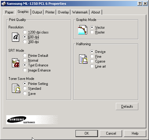 Закладка "Графика" (Graphics), помимо настройки разрешения печати, задания режима экономии тонера, выбора режима вывода графики (векторная / растровая) и метода вывода полутонов (задается устройством / точная /грубая /штриховая) позволяет также с помощью технологии SRT (технология сглаживающего разрешения) подобрать лучший режим сглаживания краев символов и изображений.