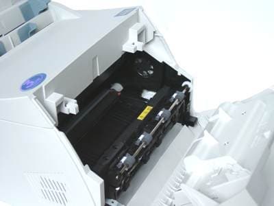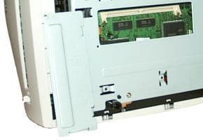 Ладно, лирику в сторону. Несколько слов о конструктивных особенностях. Как было указано выше, в ТТХ модели, имеется возможность наращивания объема памяти принтера до 68 МБ. Делается это очень просто: перевернув принтер "вверх ногами", можно обнаружить небольшую металлическую пластинку, прикрывающую 72-контактный слот SIMM. К имеющимся 4 МБ встроенной памяти можно добавить 64 МБ 72-контактный 5 В non-parity 60 нс EDO модуль SIMM. С таким же успехом вставляются менее емкие модули, было бы желание и нужда.