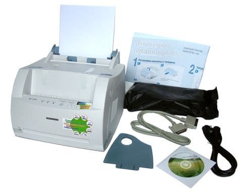При распаковке симпатичной коробки был обнаружен комплект из принтера, кассеты с тонером, шнура питания, держателя вывода бумаги, компакт-диска с драйверами, утилитами и руководством пользователя в виде файла .pdf, а также краткого руководства по установке.