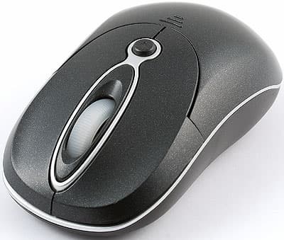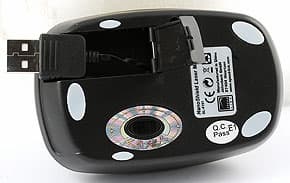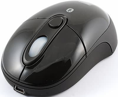 Беспроводная мышь, связь по фирменному радиоканалу на частоте в районе 27 Гц. Поставляется в прозрачном запаянном блистере, в комплект входит велюровый мешочек-кисет для транспортировки и две батарейки AAA, от которых и питается. Спинка сдвигается, батарейки вставляются. Никаких приспособлений для зарядки и аккумуляторов не предполагается, но от перезаряжаемых элементов питания работает нормально. Ресивер достаточно большой, но полностью убирается в специальное гнездо внутрь мыши для транспортировки. Мышь при этом, как ни странно, не отключается. Извлекается нажатием на специальную кнопку на спинке, за колесом. Уверенная работа обеспечивается в радиусе примерно двух метров. Режим энергосбережения не очень агрессивный, «будить» слишком часто не приходится.
