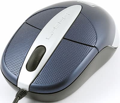 Внешний вид поинтереснее (хотя кому как вполне допускаю, что ярко-белая мышь, светящаяся красным, кого-то способна привести в полный восторг). И сенсор поновее, и размеры поменьше. Пластик для корпуса также применён вполне обычный, но вот отделка разноцветная. Брюшко и боковинки чёрные, сенсор по центру, подсветка невидимая. По углам четыре небольших лапки из белого тефлона. Скользят неплохо, но похуже лучших представителей этого рода. Интерфейс USB, мягкий шнур длиной 1,8 метра. Верх тёмно-синий, вокруг колеса и сзади вставки серебристого цвета. Кнопки отделены от спинки, вместе с её частью отделаны мелким рифлением, что оказалось приятно наощупь. Доходят до конца корпуса со всех сторон. Форма в целом небольшой «обмылок» со слегка приподнятой спинкой, симметричная. Для самых маленьких мышей такая форма представляется оптимальной.