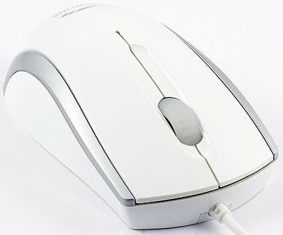 Самая большая участница обзора, пластик ярко-белый и полупрозрачный. Сенсор светится красным, на помощь ему во время работы, возможно, приходит ещё один светодиод, и вся мышь светится ярко и празднично. Провод также ярко-белый, длиной 1,6 метра. Интерфейс USB либо PS/2, переходник в комплекте, у неё единственной в обзоре. Ножки белого тефлона, скользят хорошо, сенсор по центру. Форма более всего напоминает Logitech 69, 96 или 58 серии. Прямо как сестра во всём, но беленькая, и боковинки слегка вогнутые из глянцевой пластмассы. Кнопки с боков не доходят до края корпуса, мешает декоративный серебристый ободок. Но в связи с большим размером это не критично.