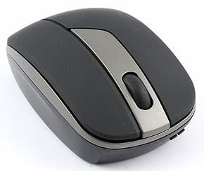 Очень похожа внешне и по размерам на предшествующую участницу, но сильно тяжелее батарейки сказываются. Четыре лапки сделаны из чёрного тефлона, который скользит немного хуже белого труднее сдвинуть с места. Красным светом подсвечивается не только сенсор, но и колесо. Сенсор расположен по линии центра тяжести, которая сильно смещена кзади из-за батареек. Поднять мышь из-за этого несколько затруднительно без перекоса назад. На брюшке находятся кнопки отключения и установки связи. В целом мышь тёмно-серая, пластик обычный. Между частями корпуса тонкий серебристый кант, что смотрится весьма элегантно.