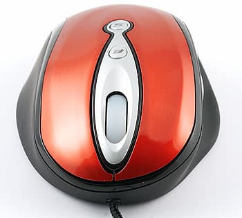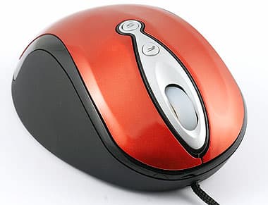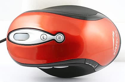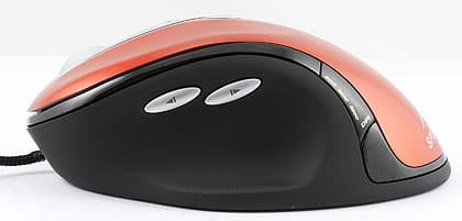 Основные кнопки объединены со спинкой, изготовлен этот блок из красного глянцевого пластика. К сожалению, очень сильно липнет к руке, так что такое решение на любителя. Также глянцевым сделан и ободок колеса, но уже серебристого цвета. Само колесо резиновое, без насечек, но это не напрягает, т.к. и поворот с чётким мягким кликом, и нажатие выполняются без каких-либо проблем. Бокового скролла нет. За колесом расположены две аппаратно управляемые кнопки: многократного нажатия на fire (т.е. левую кнопку) и переключения разрешения.