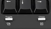 Особняком располагаются кнопочки Toggle (предназначена для переключения между приложениями; по сути жестко заданный хоткей для комбинации Alt-Tab) и Close (закрытие текущего приложения; полный аналог Alt-F4), и по внешнему виду отличающиеся от всех остальных. Помещены они близко к переднему краю клавиатуры — под блоком управления курсором. В принципе, можно поспорить о том, стоит ли столь деструктивную команду, как Close выставлять в столь доступное место. Можно и не спорить — вследствие формы возможность случайного нажатия на нее достаточно невелика. К тому же и современные приложения давно научились при необходимости интересоваться у пользователя — действительно ли он хочет их покинуть и не стоит ли при этом сохранить изменения в открытых файлах.