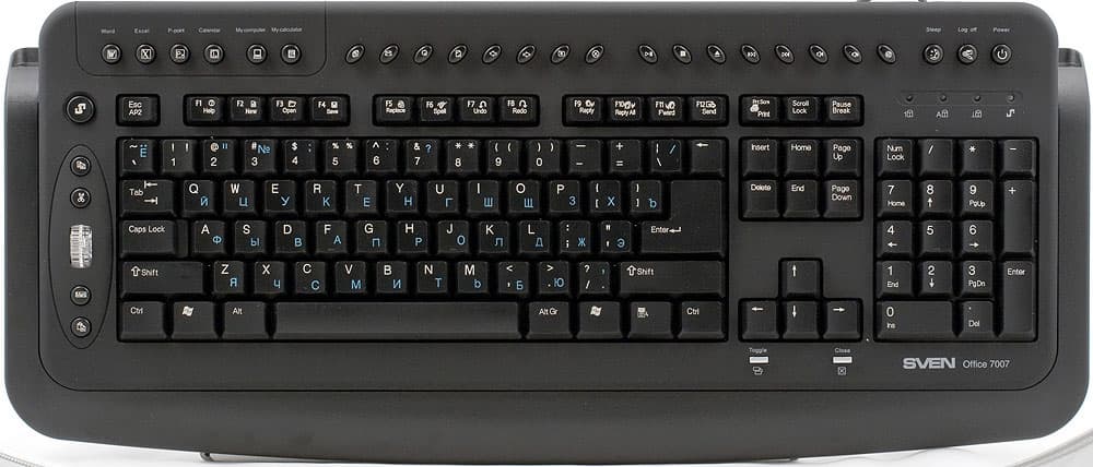 В прошлых статьях мы уже рассмотрели четыре клавиатуры SVEN, весьма недорогих, но обладающих хорошей функциональностью, вполне отвечающей требованиям сегодняшнего дня. Сегодня на повестке дня пятая модель, пусть и более дорогая, нежели, например, Multimedia 730/733, зато и наиболее функционально насыщенная. По сути, Office 7007 включает в себя все, что вообще может на данный момент предоставить пользователю проводная клавиатура, если не переходить на уровень бантиков, типа ЖК-дисплеев (на которые все равно никто не смотрит), встроенных микрофонов (в лучшем случае среднего качества) и прочих украшений, которые хороши для того, чтобы удивлять друзей, но малополезны для практической работы. Особенно для работы :)