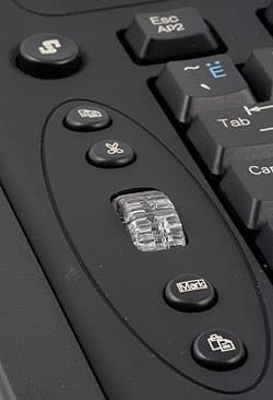 Очень интересна и левая панель, чуть выступающая на поверхности корпуса. В ней расположено колесико прокрутки и четыре кнопки. Что касается колесика, то оно не работает без программного обеспечения (к сожалению; это для USB-клавиатур как правило данная функциональность легко реализуется и штатными средствами, ибо HID), а после установки ПО полностью эмулирует мышиное, вплоть до способности нажиматься и выполнять ту функцию, которая присвоена средней клавише мыши. Отличительной (от большинства клавиатур) его особенностью является исполнение из прозрачной пластмассы и яркая синяя подсветка. Красиво, но через некоторое время может начать раздражать, поскольку неотключаемая. Все же конструкторам стоило пойти на небольшое удорожание клавиатуры, но сделать подсветку выключающейся при длительном бездействии устройства. А кнопки просты — над колесиком Copy и Cut, под ним — Mark (предназначена для выделения текста курсорными клавишами без необходимости удерживать Shift; выход из режима — любая клавиша, отличная от курсорной) и Paste. Эти четыре кнопки работают и без программного обеспечения, а их удобство человеку, активно работающему с текстами, трудно переоценить (честно говоря, я могу себя заставить работать на клавиатуре без подобных кнопок только по необходимости — когда таковые тестировать приходится :)). Их расположение рядом с колесиком тоже достаточно логично при редактировании документов: правой рукой работаем с клавишами редактирования и курсорными, левой — прокрутка на небольшие расстояния колесиком, выделение, вырезание, копирование и вставка текста. И, главное, все функции выполняется без многоклавишных комбинаций!