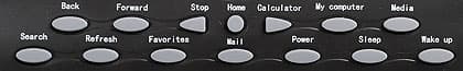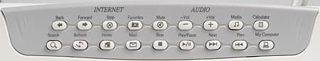 В принципе, с назначением кнопок мультимедийных клавиатур, использующих стандартные драйверы Windows, мы знакомились уже не раз, поэтому сегодня я буду краток. Итак, что мы имеем в случае данной модели? Левая группа из восьми кнопок подписана «INTERNET» из чего сразу вытекает ее назначение. Верхний ряд управляет браузерами: Back, Forward и Stop, работающие везде, а также кнопка Favorites, назначение которой в Internet Explorer всем известно, а в других браузерах она не работает. В нижнем слева помещена кнопка Search, открывающая поисковую панель Windows либо Internet Explorer, если последний запущен. Следом за ней кнопка обновления текущей страницы, еще правее — кнопка Home, открывающая стартовую страницу браузера, либо запускающая его самого (если еще не запущен), самая правая — Mail, запускающая программу электронной почты. Следующая группа озаглавлена как «AUDIO» и включает в себя три кнопки управления громкостью и кнопку доступа к медиабиблиотеке Windows Media Player или его запуск (верхний ряд), а также четыре кнопки управления проигрыванием (нижний ряд). Крайние справа кнопки запускают калькулятор (верхняя) и открывают папку «Мой компьютер» нижняя.