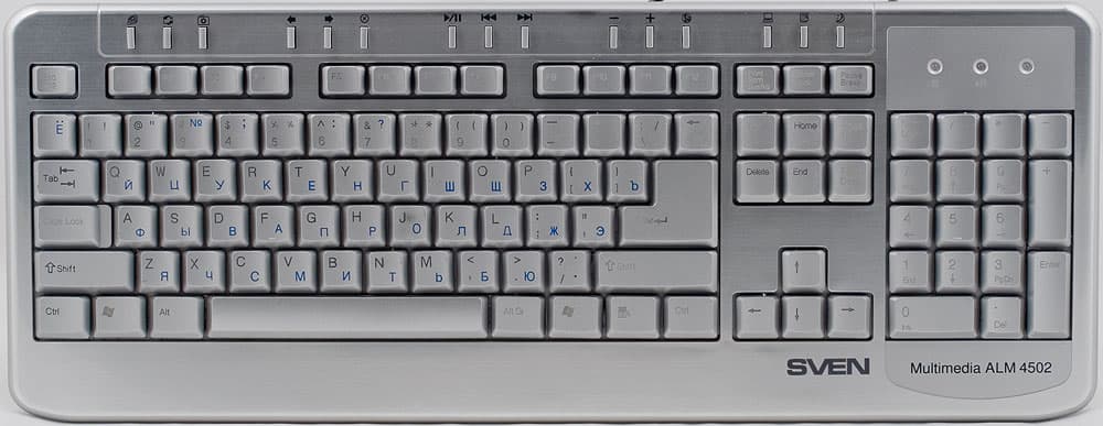 Уже не первый раз при знакомстве с продукцией SVEN мы встречаемся с совершенно стандартными основными блоками клавиатур. В данном случае никаких изменений — все четыре блока (основной алфавитно-цифровой, дополнительный цифровой, редактирования и управления курсором) целиком и полностью заимствованы от 104-клавишной клавиатуры образца 1995 года. От нее и более ранних моделей ALM 4502 отличают лишь уменьшенные вдвое по одному направлению функциональные клавиши, но это встречалось и в других изученных нами клавиатурах SVEN, так что это тоже можно считать традицией.