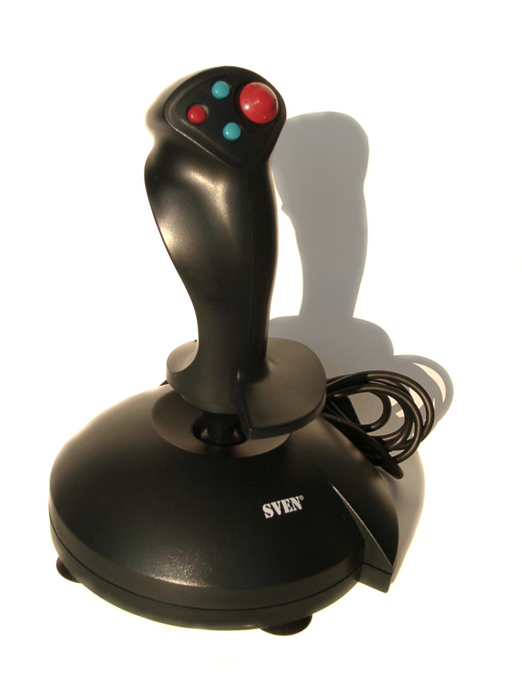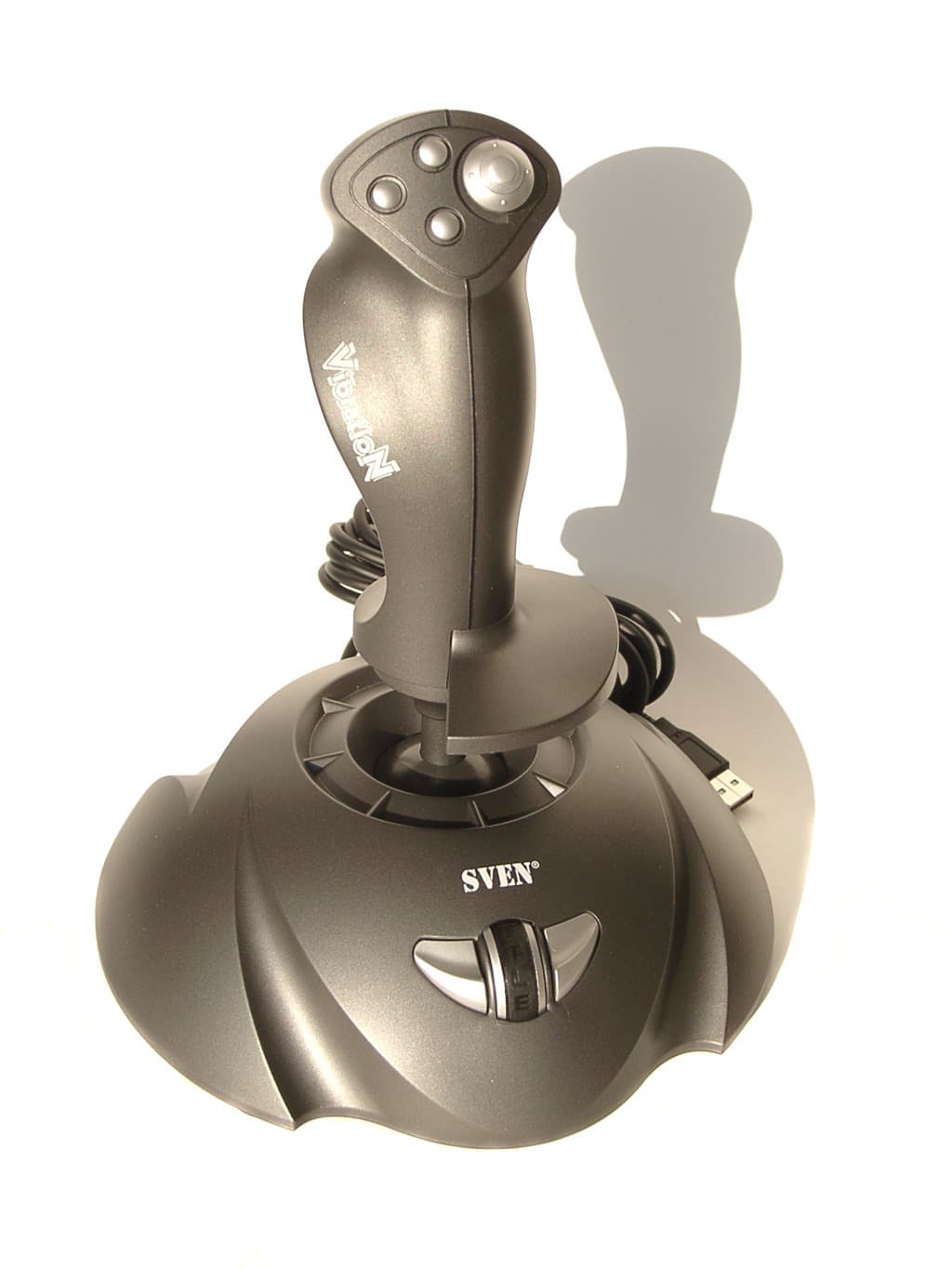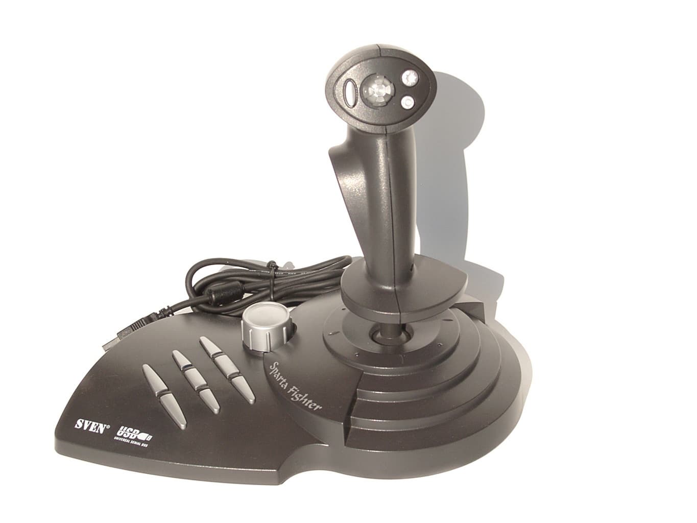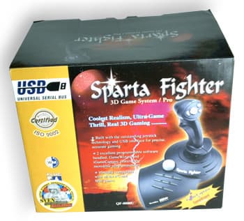 Эту и следующую модели производитель позиционирует как джойстики High-End. Что же представляет собой Sparta Fighter? Это полноценный 3D-джойстик с регулятором Throttle, переключателем вида (POV), четырьмя кнопками на рукоятке и восьмью кнопками на основании корпуса. Всего получается двенадцать функциональных кнопок. Лично мне кажется, что такого их количества достаточно для любой игры. Интерфейсный кабель (длина 1.83м) заканчивается USB разъемом, и никакого другого интерфейса в данной модели нет. Содержимое коробки так же скромно, как и у всех остальных моделей Rockfire, но включает в себя все необходимое. В него входит сам джойстик, гарантийный талон от SVEN, краткое руководство пользователя, и диск с программным обеспечением GameWizard v2.1.
