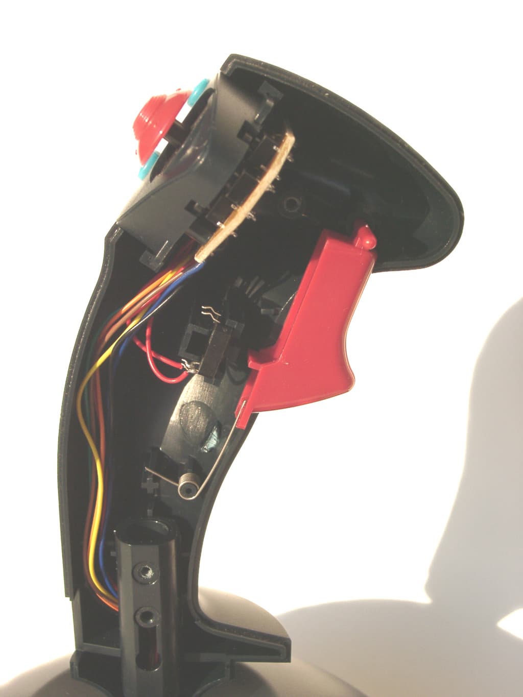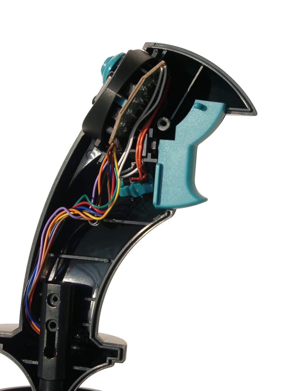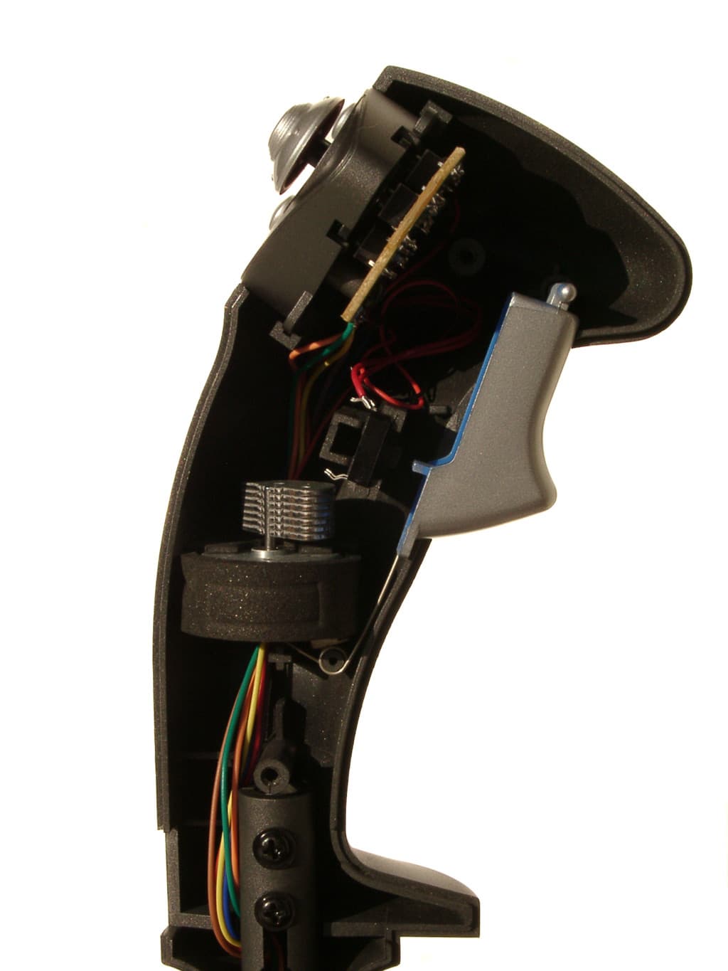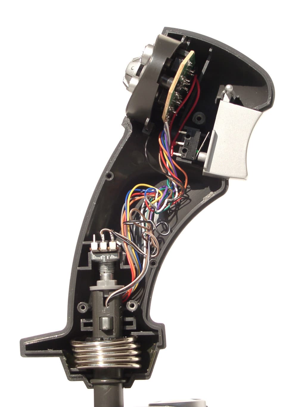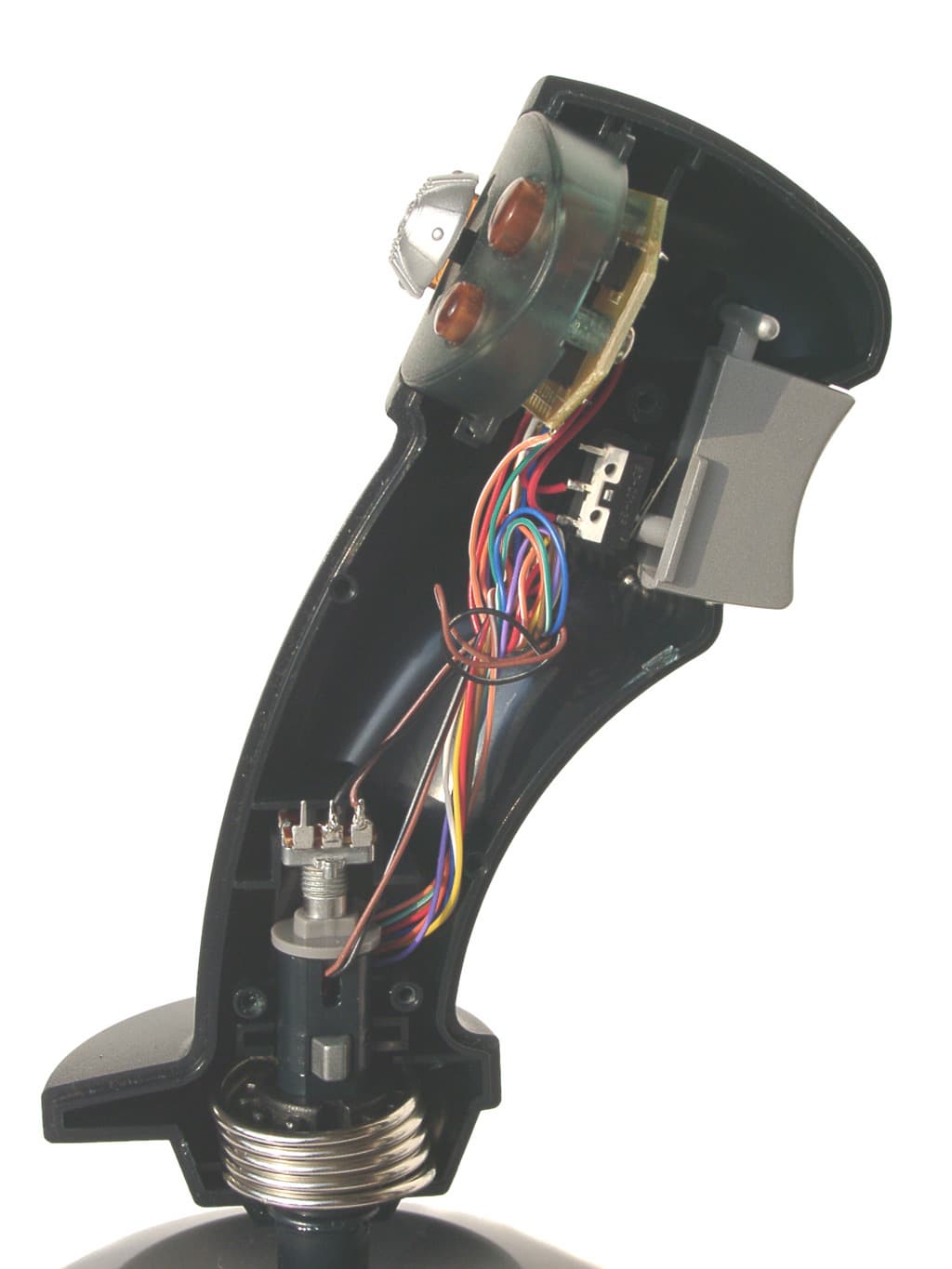 Несмотря на наличие переключателя видов (POV), электрическая схема WindStorm’a даже проще, чем у описанной выше модели QF-8ip. Обычный аналоговый джойстик, а так как никаких генераторов, имитирующих многократное нажатие кнопок, в нем нет, то и активных элементов в его схеме не содержится. В основании корпуса установлена небольшая коммутационная плата, а в рукоятке еще одна, на которой расположены микропереключатели кнопок и переключателя вида (POV). Как и в случае QF-8ip, в данной модели эти микропереключатели, к сожалению, безымянны. Механическая часть устройства ничем необычным не выделяется.