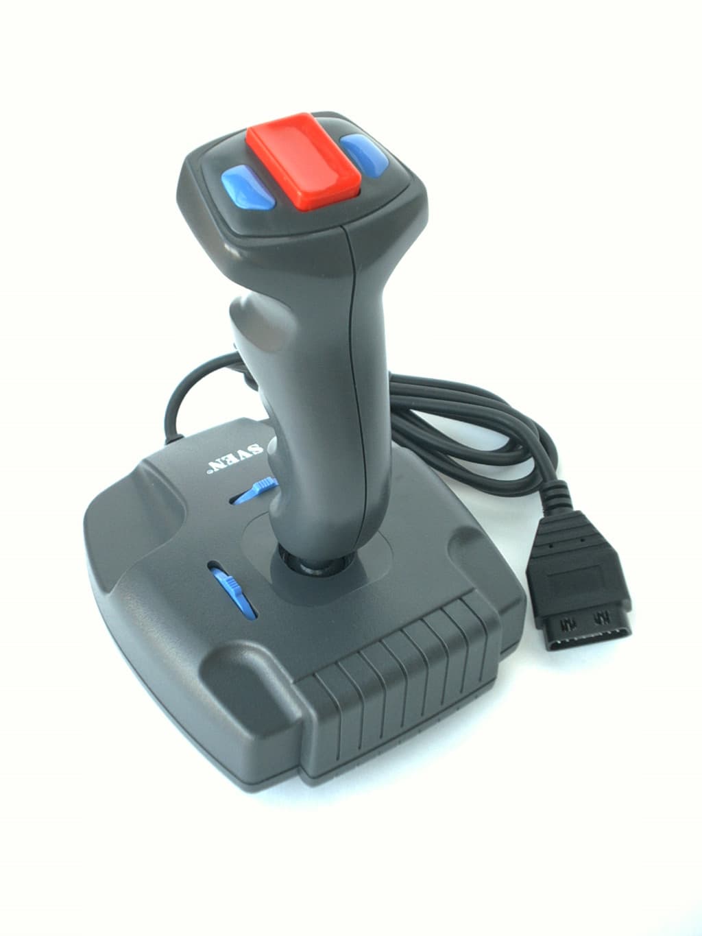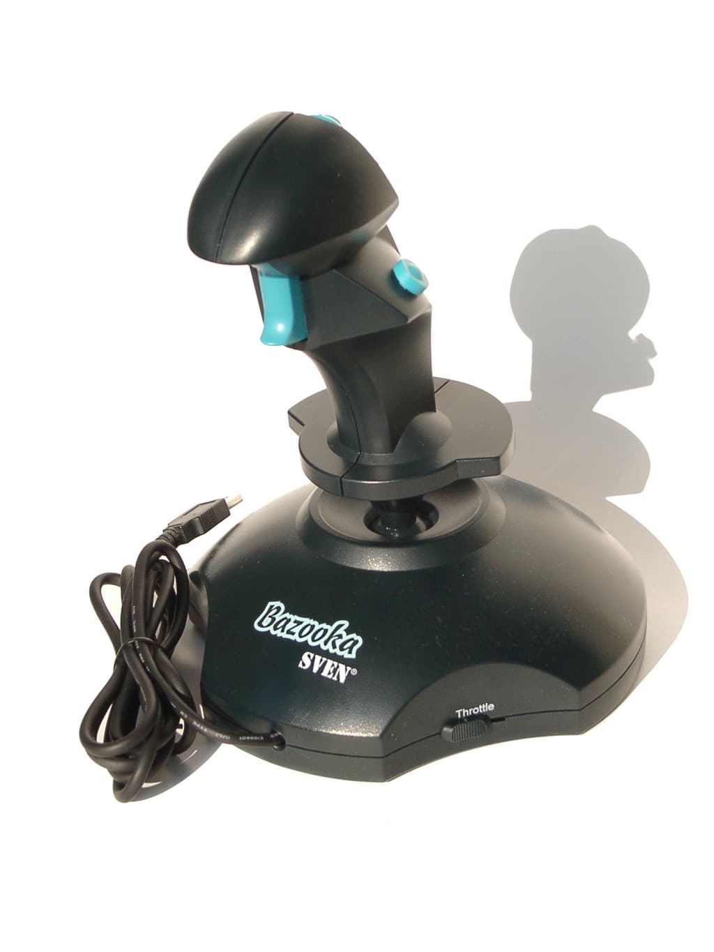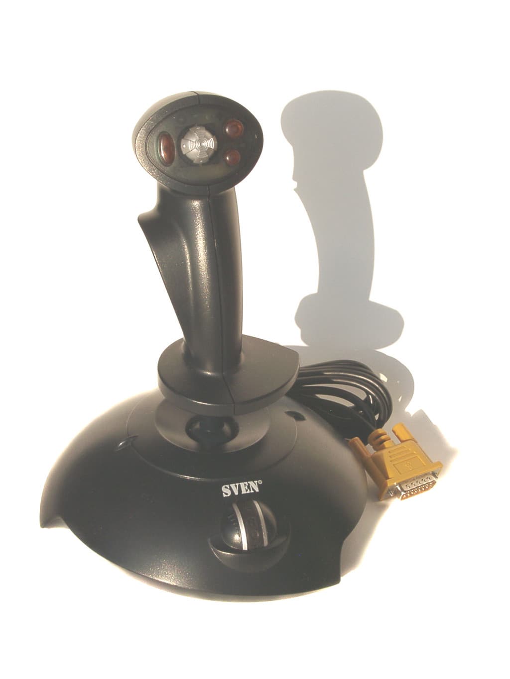 Ну, вот мы и дошли до первой 3D модели! Четыре кнопки, переключатель вида, регулятор Throttle, и поворачивающаяся вокруг своей оси рукоятка вот, что такое QF-805IU. К положительным чертам можно отнести и гибкость подключения. Интерфейсный кабель (длина 1.83м) заканчивается разъемом для подключения к игровому порту, но вы можете воспользоваться переходником Game-USB, который поставляется в комплекте с QF-805IU, и подключить его к USB порту. Однако переходник это не все, что вы обнаружите, открыв коробку. Также в ней находятся диск с программным обеспечением GameWizard v2.1, краткое руководство пользователя, гарантийный талон от SVEN, и, конечно же, сам джойстик. Суммируя качественные показатели джойстика, о которых речь пойдет ниже, и вполне достаточный комплект поставки, можно смело рекомендовать данную модель тем, кто проводит много времени за играми и при этом активно пользуется джойстиком.
