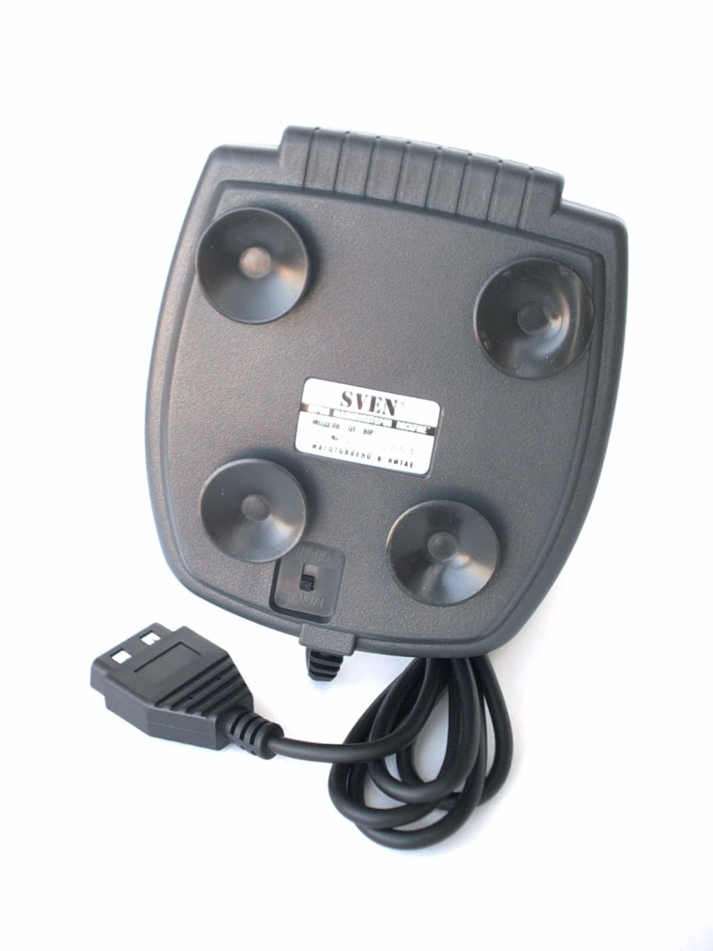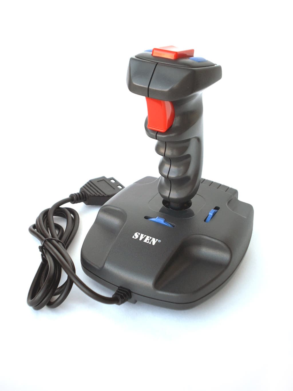 Если смотреть издалека, то эта модель очень похожа на предыдущую. Но при более близком рассмотрении выясняется, что они значительно различаются. Содержимое коробки стало богаче и включает в себя, помимо джойстика, краткое руководство пользователя, диск с программным обеспечением GameWizard v2.1 и гарантийный талон от SVEN. Сам QF-707U являет собой 2D-джойстик с шестью функциональными кнопками, регулятором Throttle и переключателем вида (POV). Интерфейсный кабель достаточно длинный (длина 1.71м) и заканчивается USB разъемом. Подключения к игровому порту у этой модели не предусмотрено. Как и у предыдущей модели, в нижней части основания корпуса расположены два движка для ручной калибровки.