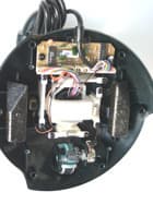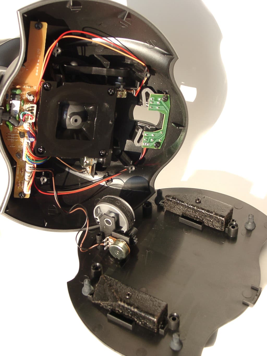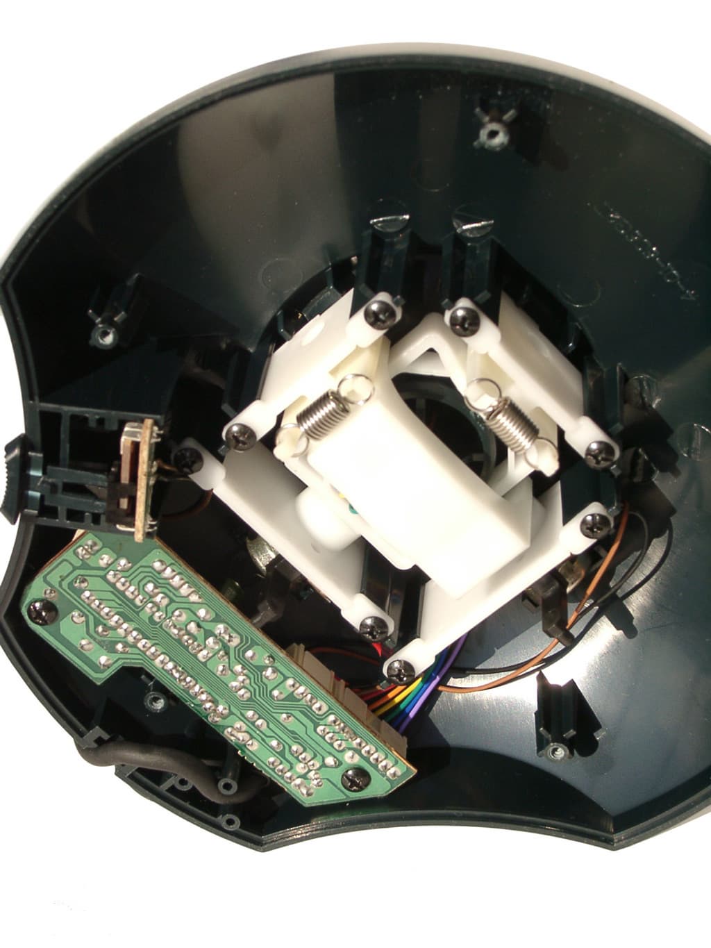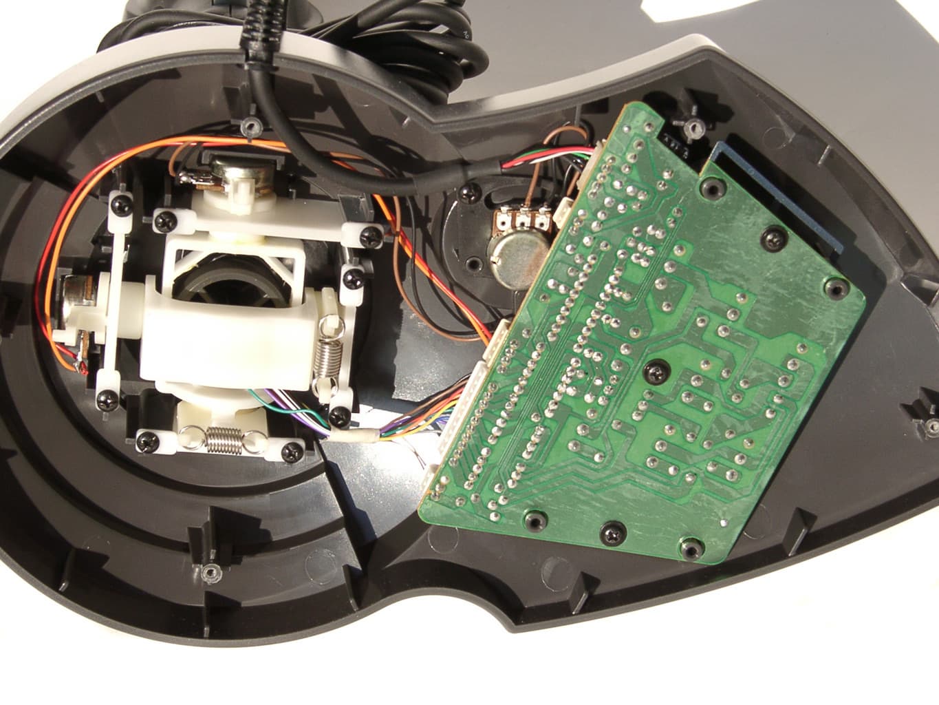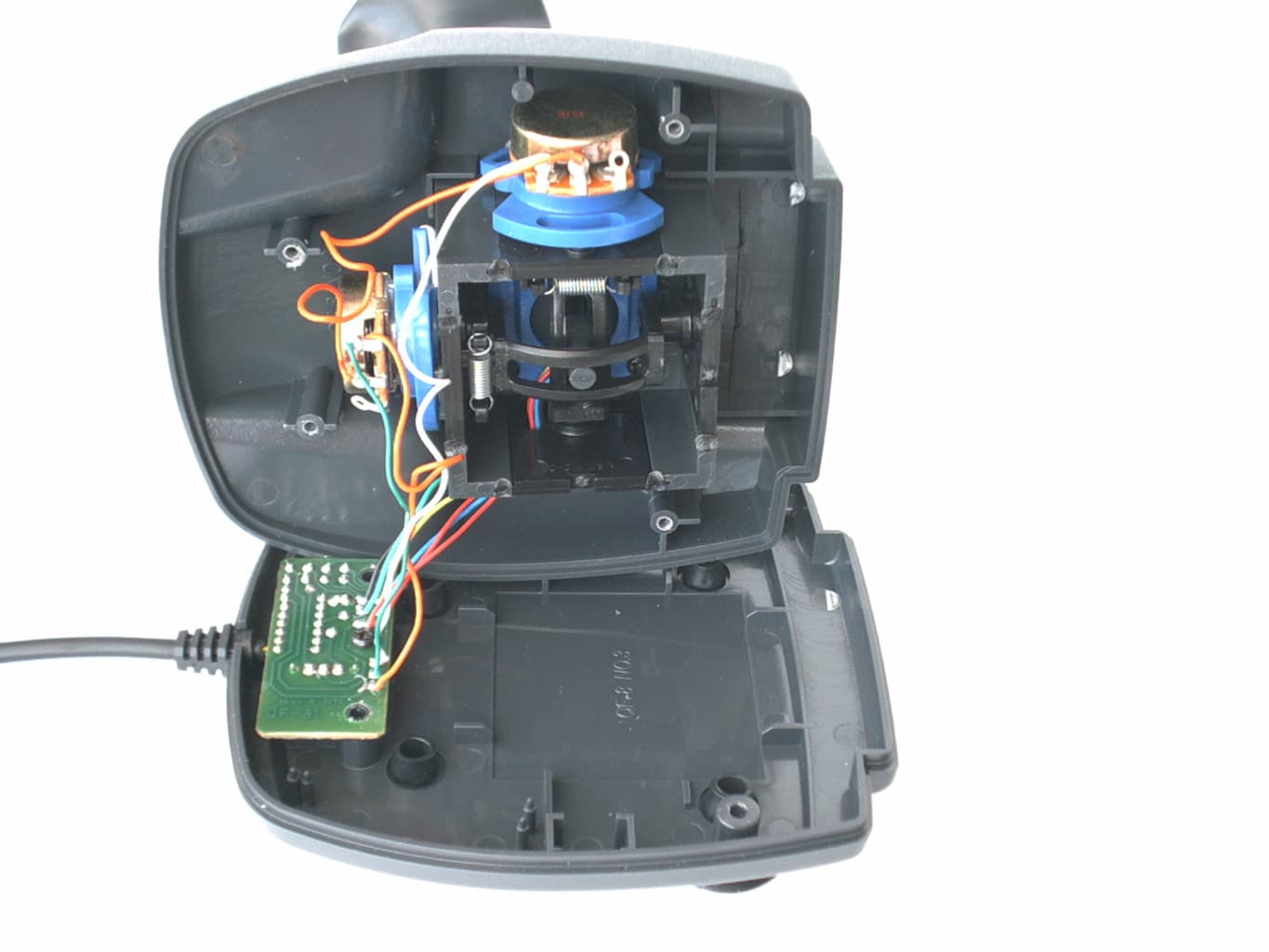 В сравнении с ранее описанными моделями, можно сказать, что внутренности рукоятки практически не изменились. Разве что, увеличилось количество микропереключателей. А вот основание корпуса и его содержимое стали намного серьезнее. Начнем с того, что вместо присосок на его нижней крышке установлены простые круглые резиновые ножки. Вроде бы, крепление джойстика на рабочей поверхности должно ослабнуть, но конструкторы это предусмотрели. Разобрав корпус, мы обнаруживаем в нем не только обычную механическую и электрическую начинки, но и два закрепленных металлических бруска. Утяжеленное таким образом основание хорошо удерживается на рабочей поверхности. Механическая часть QF-707U осталась такой же, как у описанных ранее моделей, а вот электрическая стала сложнее. Но это неудивительно, ведь увеличенная функциональная оснащенность и появление USB интерфейса соответственно повлекли за собой усложнение электрической схемы.