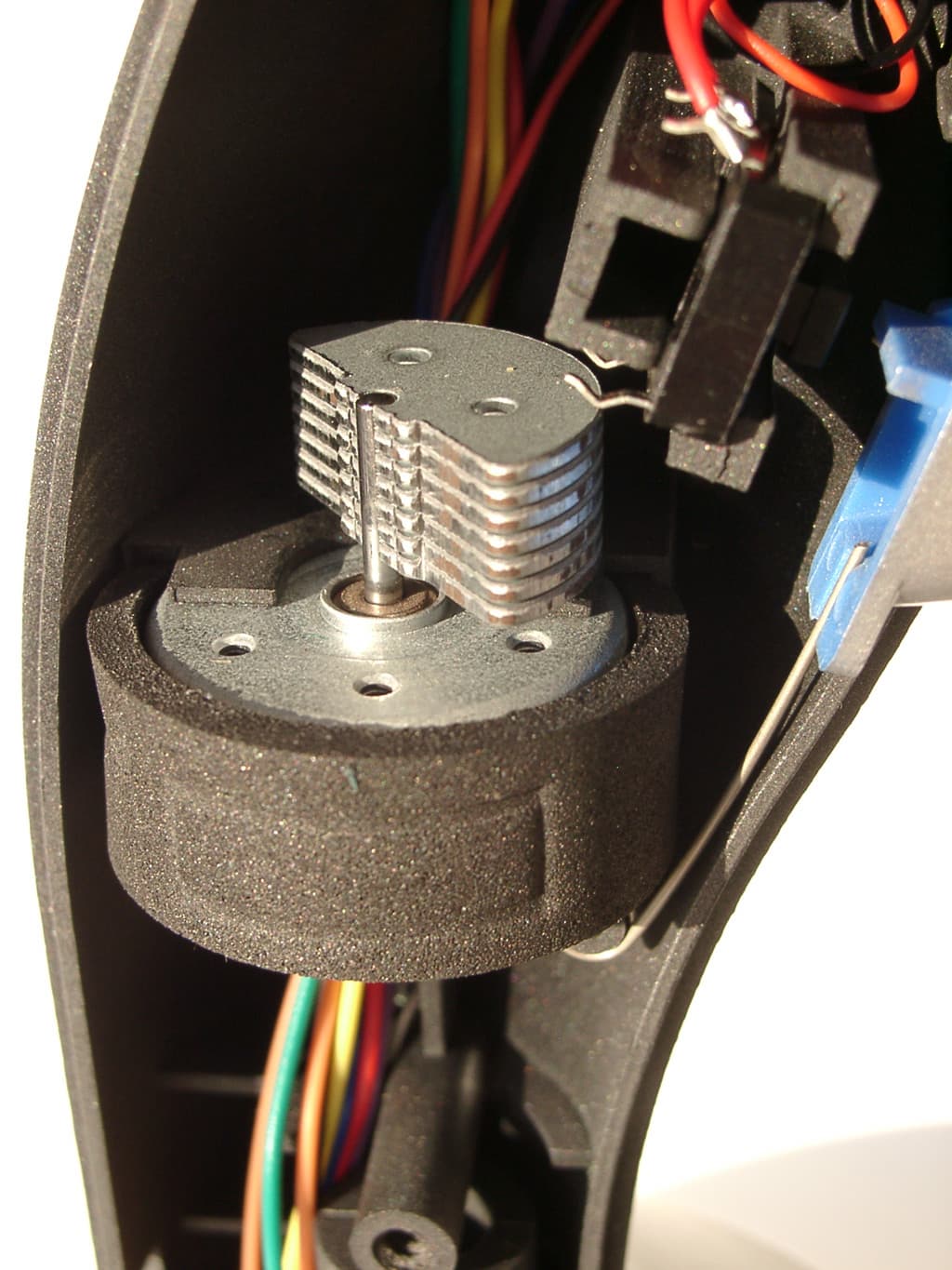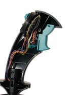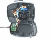 Конструкция QF-688UV не похожа ни на одну из моделей, описанных ранее. Изменилось практически все, вплоть до внутренностей рукоятки. Вы не найдете в ней переменного сопротивления, контролирующего третью ось перемещения этого 3D-джойстика. Теперь оно расположено в шарнирной системе в основании джойстика. Зато на его месте установлен микродвигатель с пластинчатым наборным эксцентриком. Именно он создает эффекты вибрации обратной связи. Двигатель невелик и, как я уже писал, не способен создать сильной вибрации рукоятки джойстика. Изменения произошли и в основании корпуса. В нем установлена совершенно новая шарнирная система, не встречающаяся в других джойстиках Rockfire. А в остальном, все более-менее похоже на более младшие модели. Те же металлические бруски, четыре присоски для крепления на рабочей поверхности, и неотъемлемая печатная плата. Какие либо намеки на элементы ручной калибровки джойстика, как снаружи, так и внутри его, отсутствуют. Но, не так уж они на самом деле нужны.
