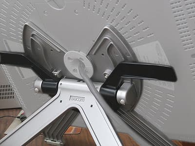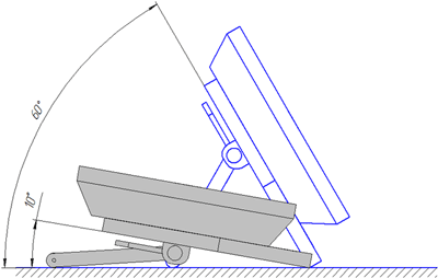 Кстати, заметим, что на первой фотографии планшет практически лежит на столе. А на второй наоборот почти перпендикулярен его поверхности. Фокус в том, что этот угол можно регулировать: для этого и предусмотрены два черных рычага. Стоит их потянуть на себя, и две задние ножки откатываются под весом устройства, угол между поверхностью планшета и стола уменьшается градусов до десяти. Передние ножки при этом всегда остаются на месте: они, в отличие от задних с колесиками, покрыты хитрым не скользящим полимером.