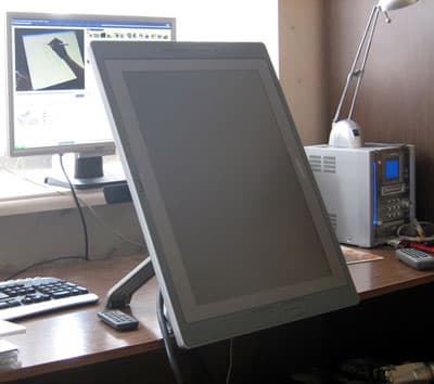Удобно ли, когда видишь и рисуешь на одной и той же поверхности? Вспомним, что планшеты всеми силами пытаются имитировать лист бумаги или холста, на котором сразу видно, что ты нарисовал. Вывод, думаю, очевиден: да, это удобнее, чем водить пером по столу, глядя в монитор. Есть ли в этом необходимость? Нет, что доказывали много лет до и доказывают по сей день многие иллюстраторы и дизайнеры, пользуясь классическим Intuos. Когда-то также не было необходимости в сотовых телефонах, автомобилях и аэропланах. Хорошо ли, что рабочая поверхность планшетомонитора (хорошее название, кстати; жаль, что маркетологи остановились на канцелярском «интерактивный перьевой дисплей») по площади где-то между листами бумаги формата А3 и А2? Если не планировать брать его с собой в поезд и самолет — да, хорошо. Стоит ли использовать устройство в качестве единственного дисплея? Я могу себе представить так организованное рабочее место, но мне так работать было бы неудобно. Полагаю, небольшой семнадцатидюймовый монитор будет отличным дополнением Синтику.