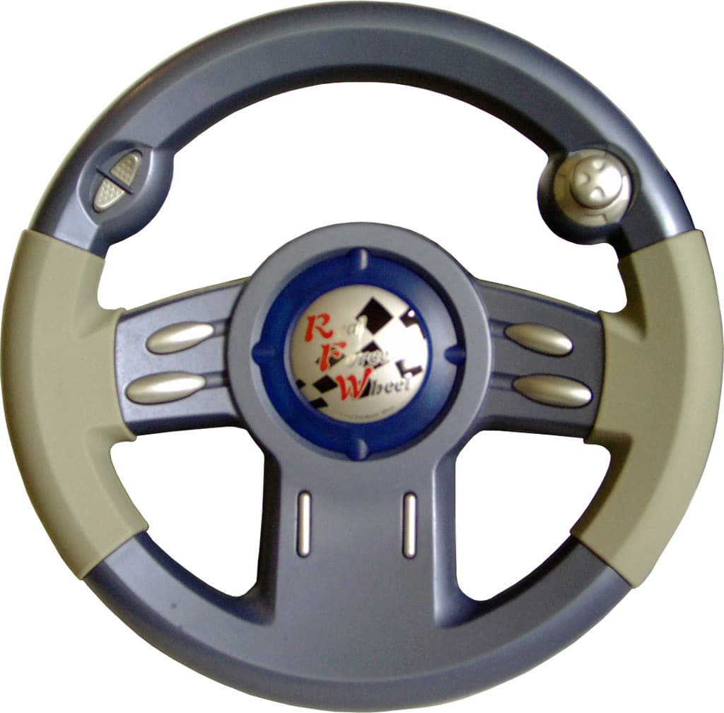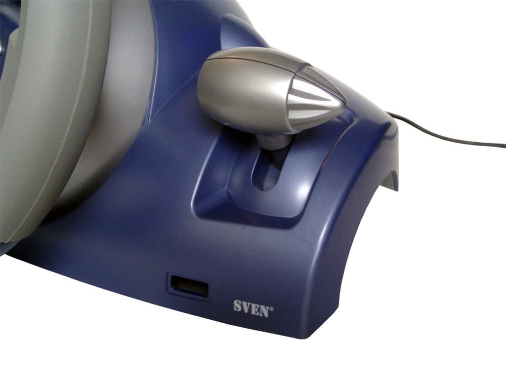 Как можно заметить, смотря на фотографии, большая часть элементов управления Rockfire QF-2000IF расположена на лицевой стороне рулевого колеса, диаметр которого равен 25.3см. В центре, под декоративной пластиковой вставкой, находятся два светодиодных индикатора, индицирующих наличие питающего напряжения и включение режима вибрационной обратной связи. Справа, слева, и снизу от центра размещены шесть функциональных кнопок. Еще две, те, что дублируют собой рычаг переключения скоростей, располагаются слева вверху от центра. Справа вверху установлен восьмипозиционный переключатель видов (POV). Все кнопки и переключатель расположены очень удачно и хорошо доступны. Думаю, что никаких нареканий на них ни у кого возникнуть не может. Итого, помимо переключателя видов, на лицевой стороне рулевого колеса расположены восемь программируемых функциональных кнопок. Но, как я уже писал, Rockfire QF-2000IF оснащен двенадцатью такими кнопками. Где же оставшиеся четыре? Искать их нужно с тыльной стороны рулевого колеса, там, где обычно расположены “крылышки”. Сгруппированные по две, кнопки располагаются симметрично, относительно оси колеса. Чтобы пользователь мог пользоваться ими на ощупь и при этом не перепутать, на верхних кнопках отлиты пупырышки. Конечно, любителям “крылышек” эти кнопки не смогут стать их полноценной заменой, но остальным пользователям, я думаю, они придутся по вкусу. Так же по вкусу придется и резиновое покрытие. Хоть оно и не полностью покрывает колесо, но даже того, что есть, вполне хватает, чтобы обеспечить должный комфорт во время игр. Резина не скользкая и шероховатая, так что скольжения рук по колесу не будет. Еще одним положительным качеством Rockfire QF-2000IF является угол поворота колеса. Он оказался точно таким же, как и у ранее описанного в “Эффектном колесе” манипулятора Logitech MOMO и составил 230 градусов (±115 градусов).
