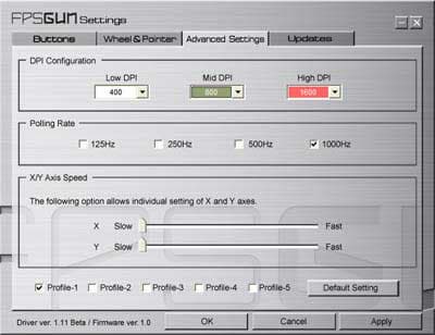 Здесь уже интереснее, как во всех игровых мышах. Имеется пять профилей, переключаются только здесь. Я, во всяком случае, другого способа не нашёл. Можно настроить различную чувствительность для перемещений по горизонтали и вертикали, выбрать частоту опроса порта USB из четырёх значений и задать разрешения сканирования для трёх слотов. Для Low DPI доступны значения 400 и 600, для Mid DPI 800, 1000 и 1200, а для High DPI 1400, 1600 и 2000. Т.е. по факту от 400 до 2000 с шагом в 200, чего вполне достаточно. Переключение между разными уровнями происходит циклически, по нажатии на кнопку на передней части. Индикатором служит подсветка колеса, для высокого разрешения красная, для среднего синяя, а для низкого фиолетовая, т.е. горят оба светодиода. В целом всё вполне соответствует позиционированию и классу манипулятора (в этой вкладке).