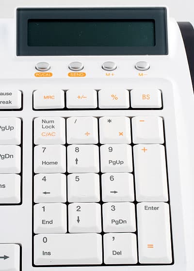 Главная же «фишка» притаилась справа в верхнем углу — прямоугольный жидкокристаллический дисплей выдает встроенный в клавиатуру и совмещенный с дополнительным цифровым блоком самый обычный калькулятор на 12 разрядов. Плоскость дисплея наклонена под углом примерно 30 градусов к корпусу, образуя треугольный бугорок. Также этот дисплей выполняет функции индикаторов состояния клавиш NumLock, CupsLock и ScrollLock. Подробней мы остановимся на нем чуть ниже.
