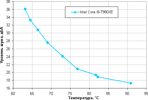 Приняв 25 дБА за критерий условной бесшумности, получим примерную максимальную мощность процессоров, соответствующих этому уровню: порядка 165 Вт для процессора Intel Core i9-7980XE. Гипотетически, если не обращать внимания на уровень шума, пределы мощности можно увеличить еще где-то до 200 Вт. Еще раз уточним: это в жестких условиях обдува радиатора нагретым до 44 градусов воздухом; при снижении температуры воздуха указанные пределы мощности для бесшумной работы и максимальной мощности возрастают.