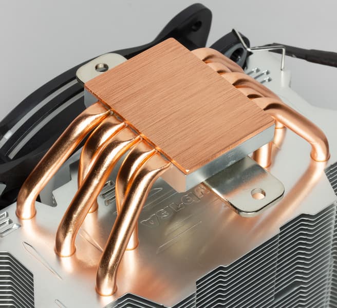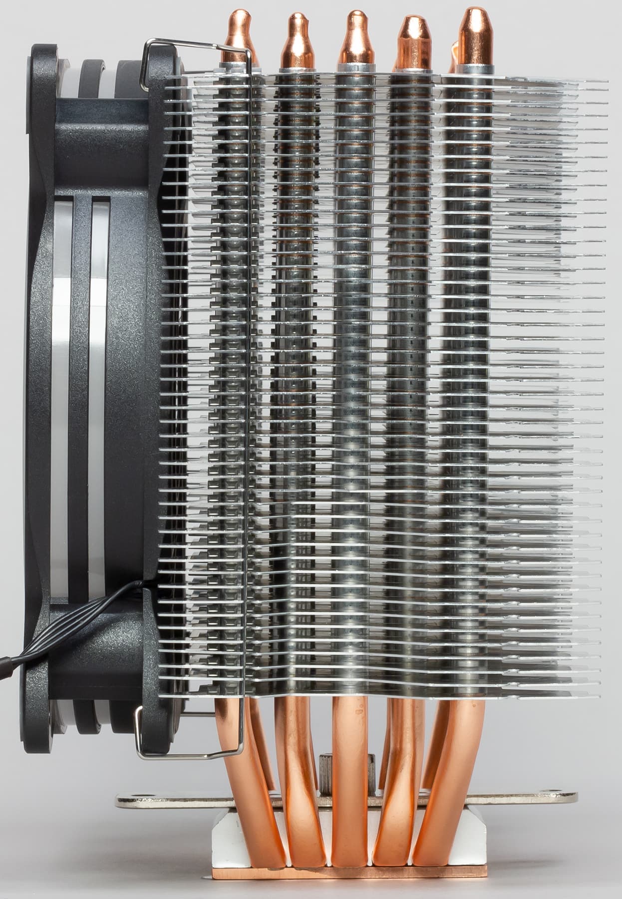Кулер оснащен вынесенным радиатором, к которому тепло от процессора передается по пяти тепловым трубкам диаметром 6 мм. Трубки, разумеется, медные. Теплосъемник состоит из алюминиевого блока и медной пластины толщиной 2 мм. Там, где трубки проходят через теплосъемник, они сплющены и впрессованы в канавки в алюминиевом блоке. Сверху, то есть снизу на трубки напаяна медная пластина, непосредственно контактирующая с крышкой процессора.