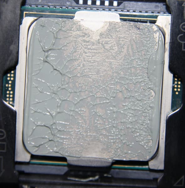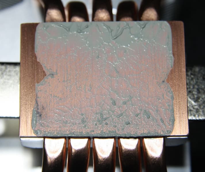 Преднанесенного термоинтерфейса нет, но производитель приложил к кулеру небольшой шприц с термопастой (указано, что ее коэффициент теплопроводности равен 4 Вт/(м·К)), количества которой хватит раза на два в случае процессоров с небольшой по площади крышкой. В тестах использовалась термопаста другого производителя. Забегая вперед, продемонстрируем распределение термопасты после завершения всех тестов. На процессоре: