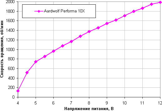 Регулировка с помощью напряжения позволяет получить устойчивое вращение на более низких скоростях. Вентилятор останавливается при снижении напряжения до 3,8 В и запускается от 5,0 В. В случае необходимости питания вентилятора от 5 В для надежного старта потребуется раскрутка более высоким напряжением.