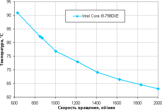 Формально в этом тесте наш процессор Intel Core i9-7980XE с TDP 165 Вт не перегревается даже на минимальных оборотах вентиляторов в случае регулировки с помощью только ШИМ. Можно даже понизить напряжение питания вентилятора до 10 В (первая точка), но температура при КЗ = 0% и 10 В близка к критической.
