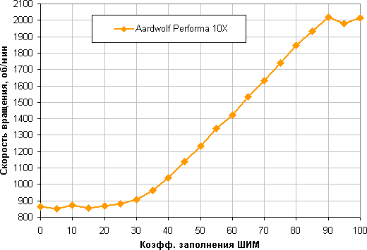 Диапазон регулировки не очень широкий. От 20% до 90% скорость вращения растет плавно и на большом участке почти линейно. При снижении коэффициента заполнения (КЗ) до 0 вентилятор не останавливается. Это может иметь значение, если пользователь хочет создать гибридную систему охлаждения, которая при низкой нагрузке работает полностью или частично в пассивном режиме.