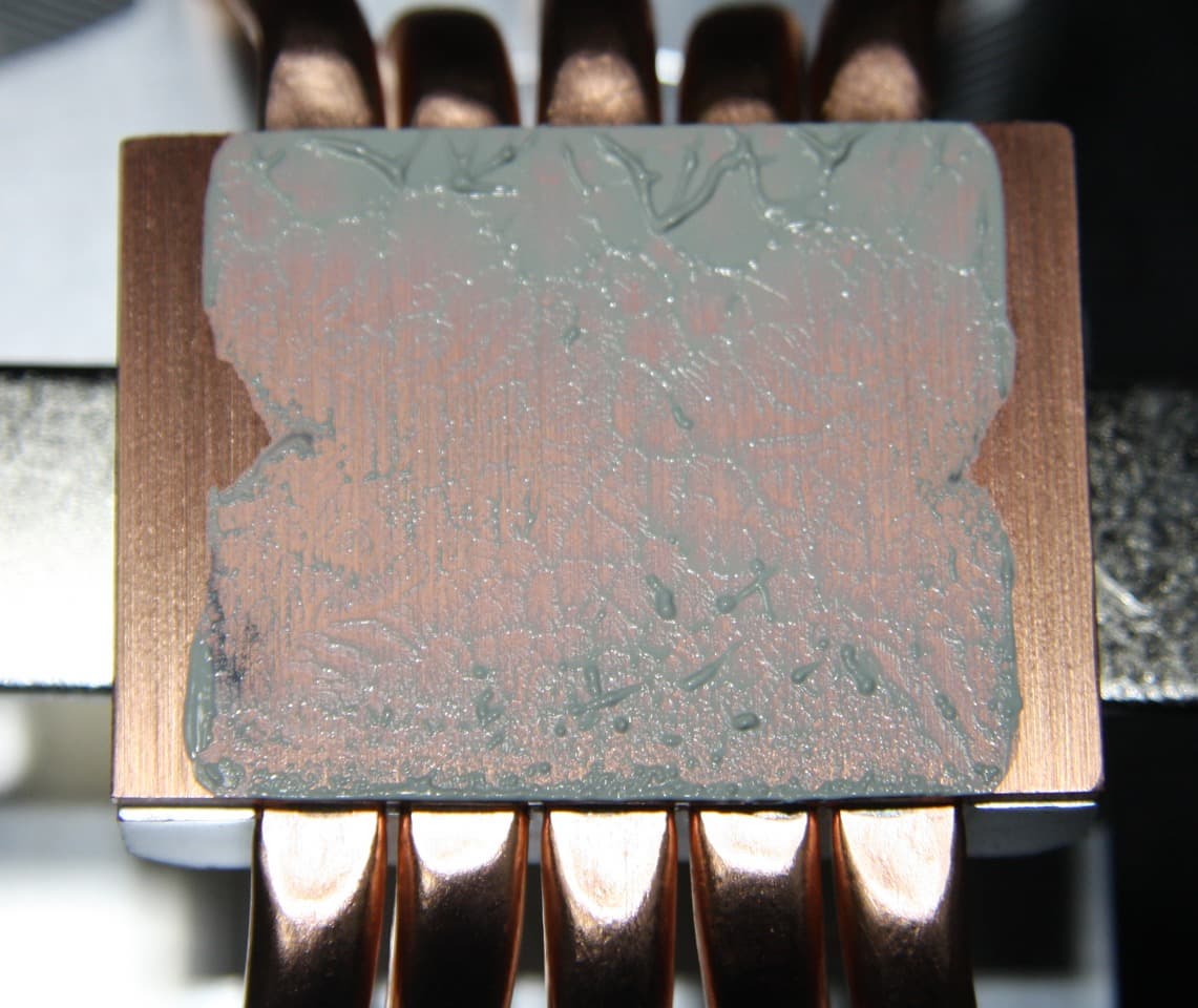 Видно, что термопаста распределилась тонким слоем почти по всей плоскости крышки процессора, а ее избыток выдавился по краям. Пятно плотного контакта проходит вдоль центральной части крышки процессора.
