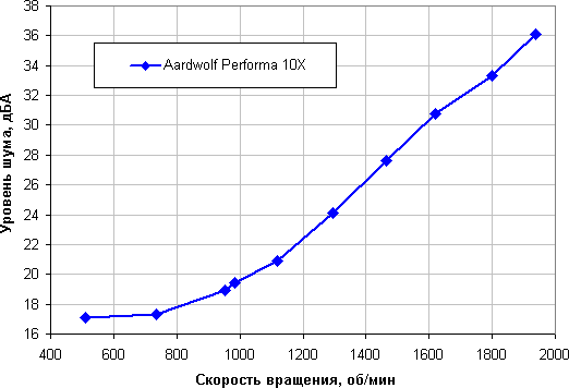 В этом тесте мы изменяли не только КЗ, но и напряжение, снизив его до 8 и 10 В в первых двух точках, соответственно, при КЗ = 0%. Этот кулер можно считать не громким устройством. Зависит, конечно, от индивидуальных особенностей и других факторов, но в случае кулеров где-то от 40 дБА и выше шум, с нашей точки зрения, очень высокий для настольной системы, от 35 до 40 дБА уровень шума относится к разряду терпимых, ниже 35 дБА шум от системы охлаждения не будет сильно выделяться на фоне типичных небесшумных компонентов ПК — вентиляторов в корпусе, в блоке питания и на видеокарте и жестких дисков, а где-то ниже 25 дБА кулер можно назвать условно бесшумным.