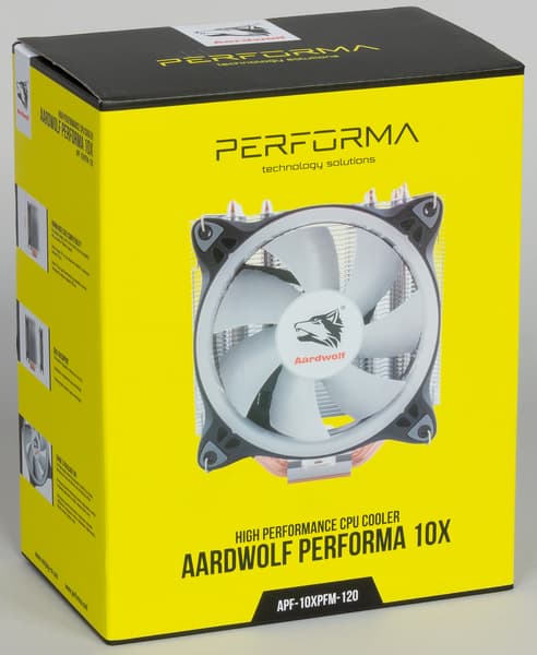 Поставляется процессорный охладитель Aardwolf Performa 10X в ярко оформленной коробке из тонкого гофрированного картона.